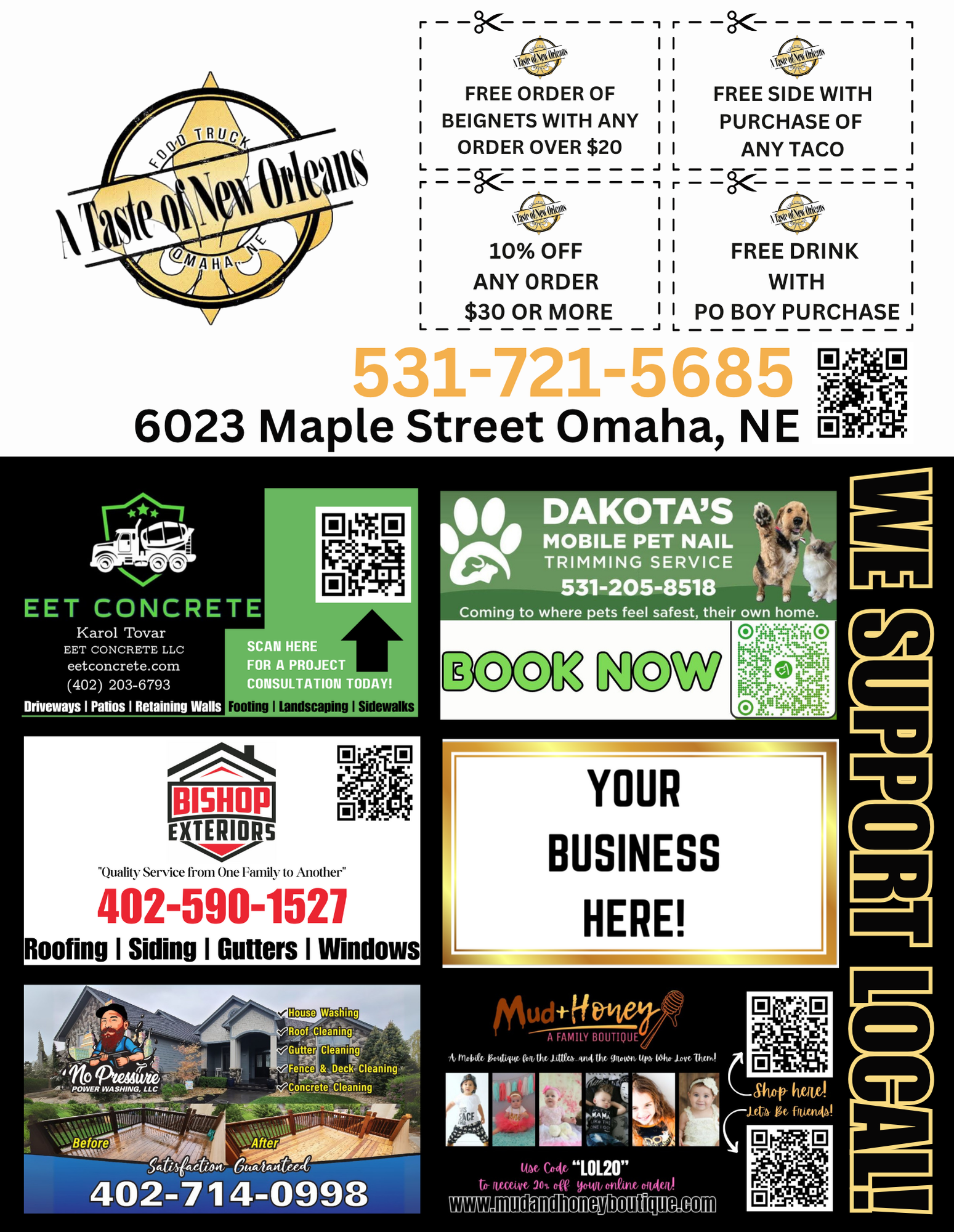 Be seen on 5000 of A Taste of New Orleans' Support Local Coupon Flyers with a business card size ad or offer of your own!