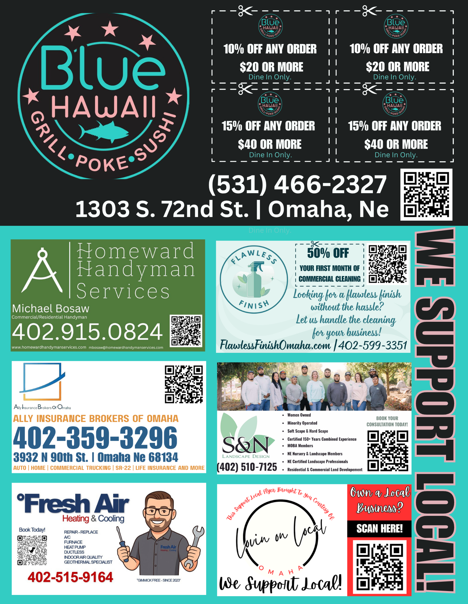 Be seen on 5000 of Blue Hawaii's Support Local Coupon Flyers with a business card size ad or offer of your own!